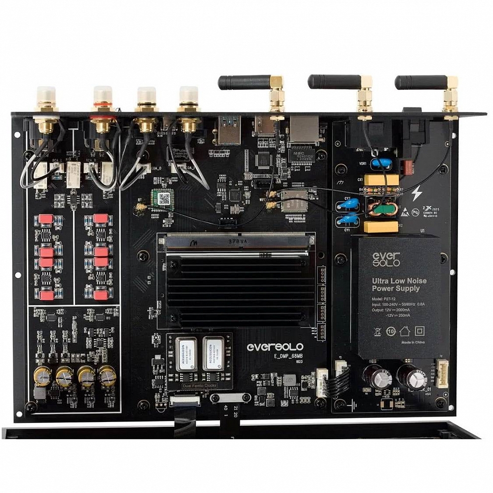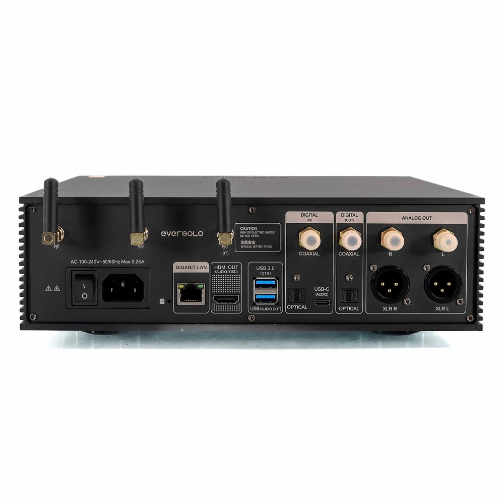 Eversolo DMP-A6 Master Edition оснащён малошумящим модулем питания, несколько конденсаторов уменьшают помехи. Кроме того, схема фильтра специально разработана для входного переменного тока и снижает высокочастотный шум от 100 кГц до 5 МГц, обеспечивая постоянную мощность, более плавный фоновый шум и более чёткие музыкальные детали. Особенно универсальный, Eversolo DMP-A6 Master Edition покрывает подавляющее большинство потребностей интеграции благодаря широкому выбору выходов. Оснащённый микросхемами обработки DOH для HDMI, Eversolo DMP-A6 может транскрибировать основной звуковой сигнал DSD с высокой точностью синхронизации HDMI.