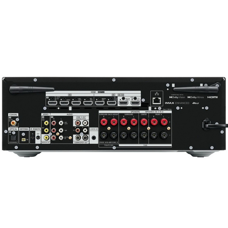 Sony TA-AN1000 представляет собой 5.1.2 (или 7.2) канальный аппарат с поддержкой Dolby Atmos и DTS:X. Как положительный момент у данной модели можно отметить наличие шести HDMI-входов, в то время как в большинстве конкурирующих аппаратов их число сокращено до четырех. Кроме того, Sony TA-AN1000 имеет два HDMI-выхода, что означает, что он способен передавать видео 8K и объемный звук на две разных жилых зоны. Остальные возможности подключения довольно скромные: оптический и коаксиальный входы, Bluetooth, а также Wi-Fi и Ethernet. Как и ожидалось, Sony имеет хорошую совместимость с HDR, с форматами HDR10, HLG и Dolby Vision с дополнительной поддержкой IMAX Enhanced.