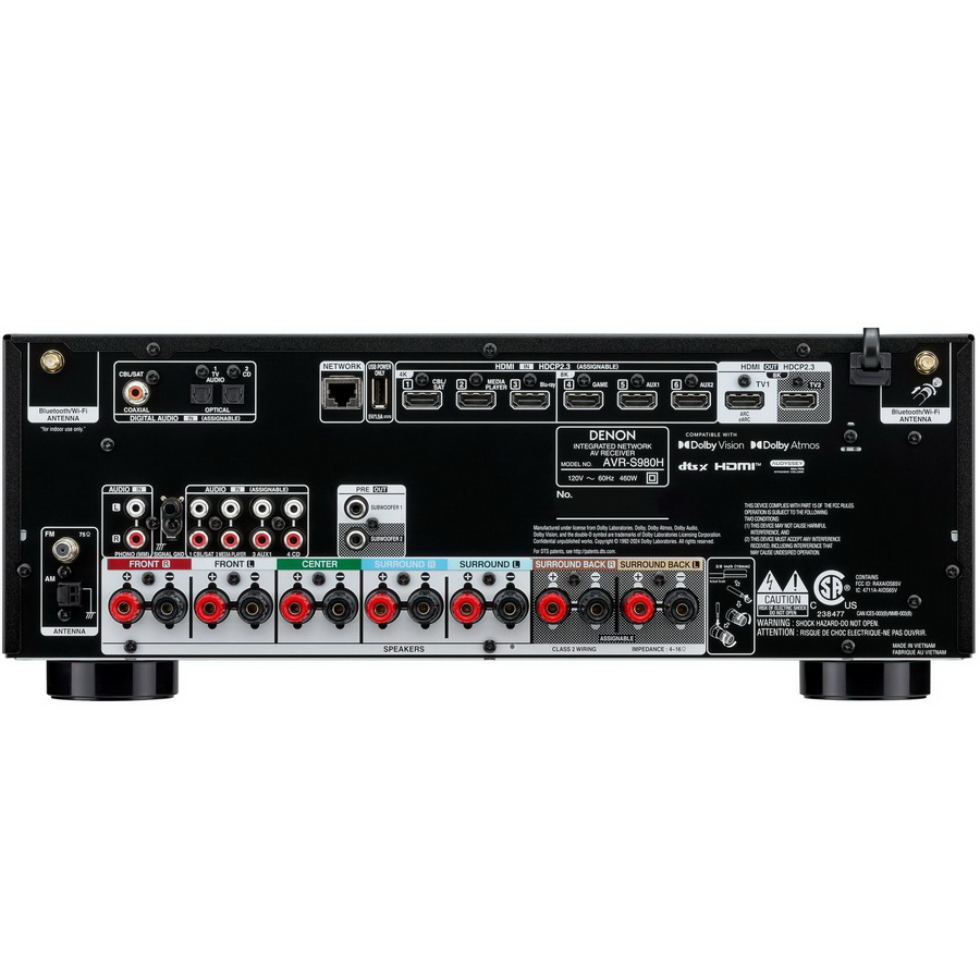 Denon AVR-S980H имеет шесть HDMI-входов и два выхода с поддержкой HDCP 2.3, видео 8K / 60 Гц, Dolby Vision и HDR10. Среди других возможностей подключения можно отметить вход для проигрывателя винила, два оптических входа, а также линейный выход для передачи сигнала на вторую озвучиваемую зону. Винтовые клеммы для подключения акустики выстроены в ряд в самом низу задней панели и имеют удобную цветовую маркировку.