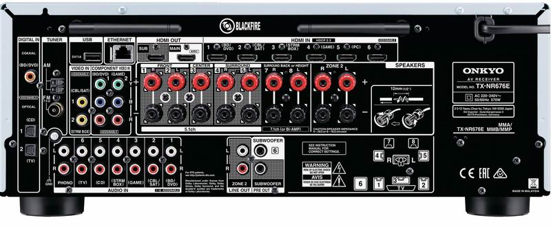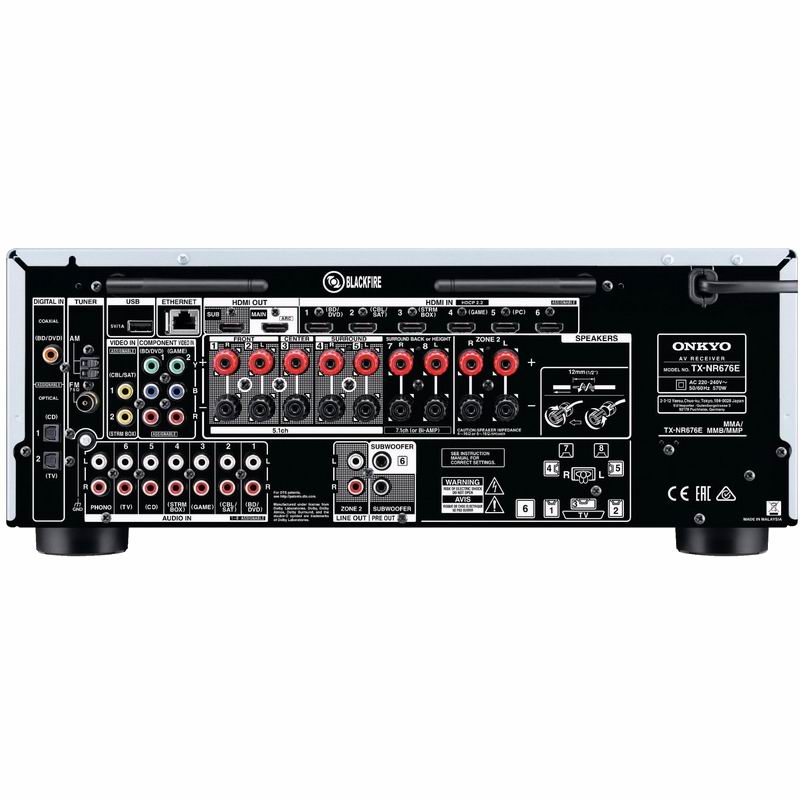 AV-ресивер оснащен восемью HDMI-входами и двумя выходами, с возможностью коммутации видеосигнала с параметрами 4K/60p и поддержкой HDCP 2.2 и HDR. Среди других входов Onkyo TX NR676E можно отметить наличие разъемов для подключения MM-звукоснимателя проигрывателя винила, что наверняка оценят многие меломаны. Аппарат ориентирован на сетевые функции и оснащен гнездом Ethernet, а также встроенным Wi-Fi-модулем. С доступных сетевых устройств возможно воспроизведение файлов всех популярных форматов, в том числе PCM до 24 бит / 192 кГц и DSD 5,6 МГц, кроме того, Onkyo TX NR676E поддерживает технологии прямой беспроводной связи с совместимыми портативными устройствами AirPlay и Google Cast, а также имеет встроенный Bluetooth-модуль. Для воспроизведения файловой музыкальной коллекции можно воспользоваться и USB-подключением (соответствующий разъем находится на задней панели).