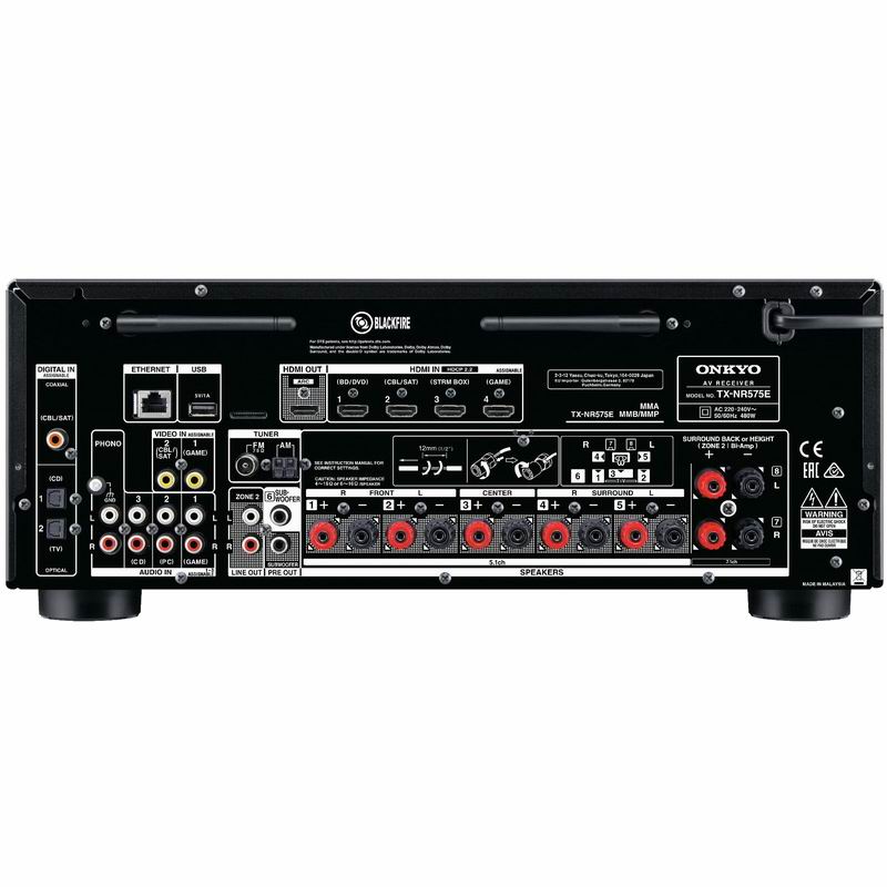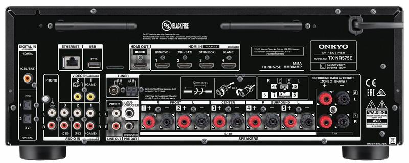 AV-ресивер Onkyo TX-NR575E оснащен четырьмя HDMI-входами и одним выходом, с поддержкой видео 4K/60 Гц и HDCP2.2/HDR. Дл настройки параметров окружающего звучания в зависимости от конкретной системы и условий размещения в Onkyo TX-NR575E используется две системы автокалиброки - AccuEQ для обычных форматов и AccuReflex для объектно-ориентированных Dolby Atmos/DTS:X. Аппарат имеет полный набор сетевых функций, поддерживает подключение по Ethernet и Wi-Fi, способен воспроизводить музыкальные файлы с доступных устройств во всех популярных форматах, в тому числе lossless и High-resolution (в PCM до 24 бит / 192 кГц и DSD2,8 МГц). Также аппарат имеет порт USB для подключения портативных накопителей, Bluetooth, выходы для создания системы мультирум (в том числе, после ожидаемого обновления ПО, с использованием беспроводной технологии FireConnect) и поддерживает технологию AirPlay для прямого соединения с iPod/iPhone и популярные музыкальные on-line сервисы.