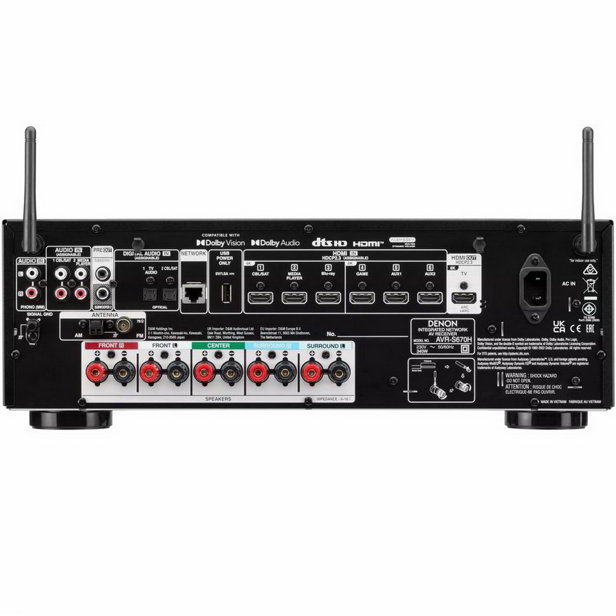 В данной модели имеются три входа HDMI и один выход с поддержкой видео 8K/60 Гц, что делает AV-ресивер совместимыми не только с любыми существующими видеостандартами, но и с теми, которые могут появиться в ближайшем будущем. При этом аппарат способен выполнять апскейлинг сигнала до разрешения 8K. Всего же у Denon AVC-S670H шесть HDMI-входов, поэтому AV-ресивер будет чувствовать себя вполне уверенно даже в системе с большим количеством источников сигнала. Поддержка обновленного возвратного аудиоканала eARC позволит полностью реализовать потенциал ТВ, способных передавать звук в форматах Dolby True HD и DTS-HD Master Audio.