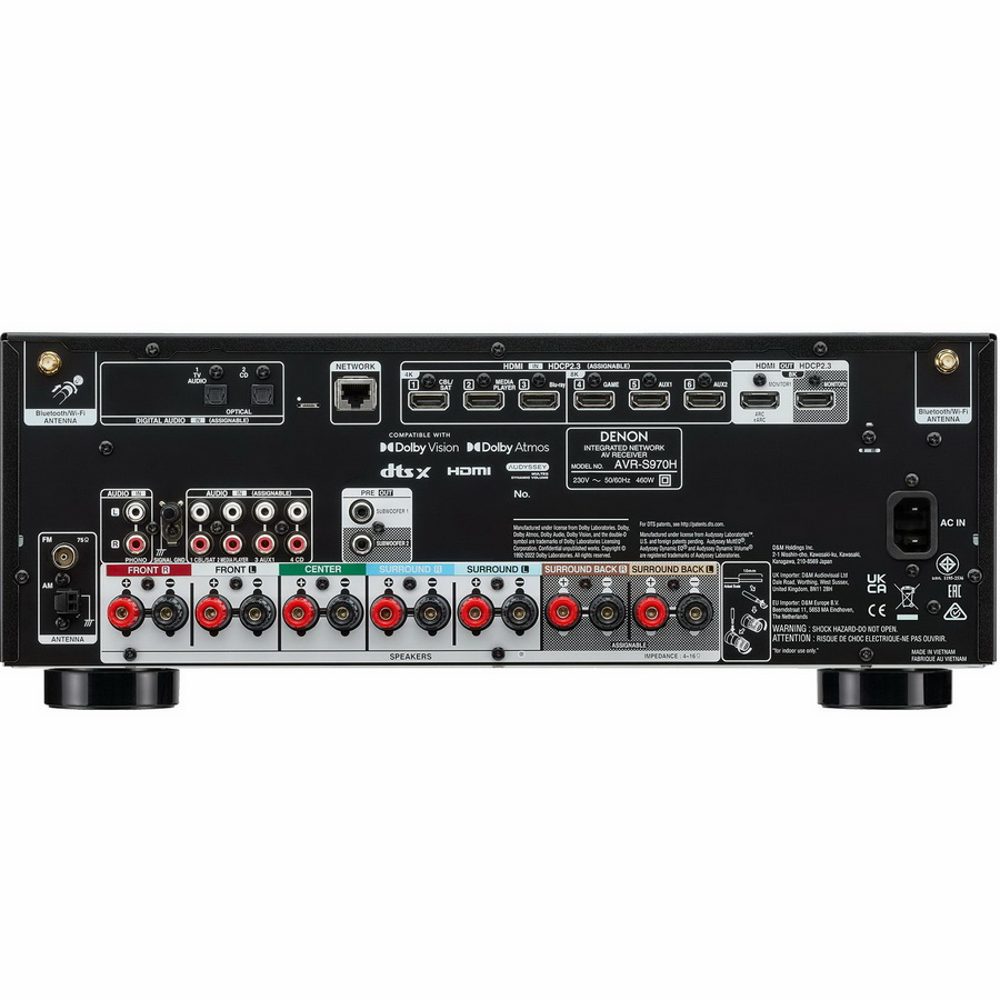 AV-ресивер оснащен шестью HDMI-входами и двумя выходами, и при этом в данной модели имеется возможность коммутации видео с параметрами до 4K/120 Гц и 8K/60 Гц. Поддержка 4К с частотой 120 Гц делает данную модель отличным выбором не только для воспроизведения видеоконтента, но и современных компьютерных игр. В AV-ресивере Denon AVR-S970H предусмотрена поддержка технологий Dolby Vision, Dynamic HDR и HDR10/10+, а также HDCP 2.3 (на всех HDMI входах и выходах).