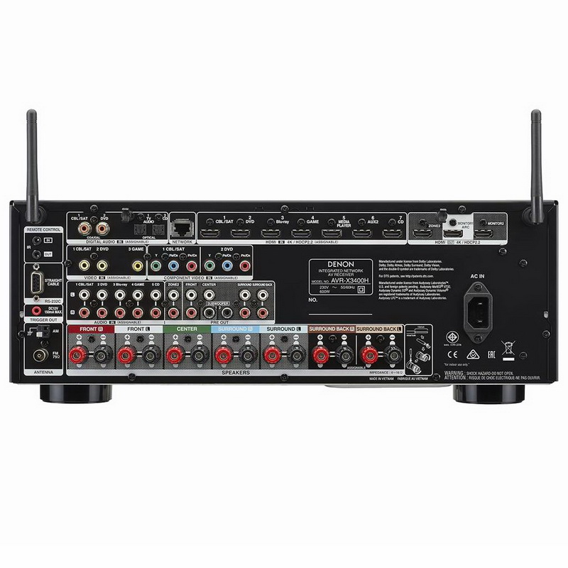 Модель оснащена восемью входами HDMI 2.0a (один на фасаде) , поддерживающими разрешение 4K Ultra HD (60 Гц), протокол защиты HDCP 2.2, HDR-изображение, цветовую субдискретизацию 4:4:4, 3D-видео и др. функции. Есть два выхода HDMI 2.0a, один из которых предназначен для зоны 2, а второй имеет функцию возвратного канала. Имеются аналоговые и цифровые аудиовходы, композитные и компонентные разъемы, RCA-выход для зоны 2 и 7.2-канальный аналоговый Pre Out с возможностью подключения двух сабвуферов. Семь пар винтовых терминалов для АС имеют цветовую маркировку.