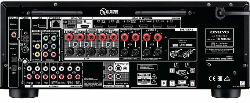 AV-ресивер оснащен восемью HDMI-входами и двумя выходами, с возможностью коммутации видеосигнала с параметрами 4K/60p и поддержкой HDCP 2.2 и HDR. Среди других входов Onkyo TX NR676E можно отметить наличие разъемов для подключения MM-звукоснимателя проигрывателя винила, что наверняка оценят многие меломаны. Аппарат ориентирован на сетевые функции и оснащен гнездом Ethernet, а также встроенным Wi-Fi-модулем. С доступных сетевых устройств возможно воспроизведение файлов всех популярных форматов, в том числе PCM до 24 бит / 192 кГц и DSD 5,6 МГц, кроме того, Onkyo TX NR676E поддерживает технологии прямой беспроводной связи с совместимыми портативными устройствами AirPlay и Google Cast, а также имеет встроенный Bluetooth-модуль. Для воспроизведения файловой музыкальной коллекции можно воспользоваться и USB-подключением (соответствующий разъем находится на задней панели).