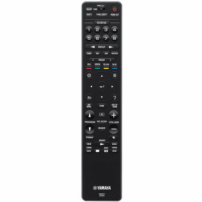 Переходя к пульту управления Yamaha RX-A780 надо отметить, что даже этот недорогой ресивер компания Yamaha комплектует полноразмерным и полнофункциональным ДУ. Пульт разделен на три секции: на верхней, расположены кнопки включения, выбора HDMI-входов, а также входов Phono, Net, USB, Bluetooth, Tuner и Audio. Далее мы имеем те же четыре кнопки для управления режимами BD/DVD, TV, NET и RADIO, что и на передней панели. Под ними расположены клавиши регулировки громкости и выбора программ, а также курсорные кнопки для управления подключенным плеером. Еще ниже имеются клавиши переключения звуковых форматов, управления декодером и режимами улучшения звука, а также номерные кнопки для выбора настроек тюнера или управления подключенным ТВ. Пульт удобно лежит в руке, он не слишком тяжелый, а расположение кнопок на нем хорошо продумано.