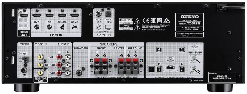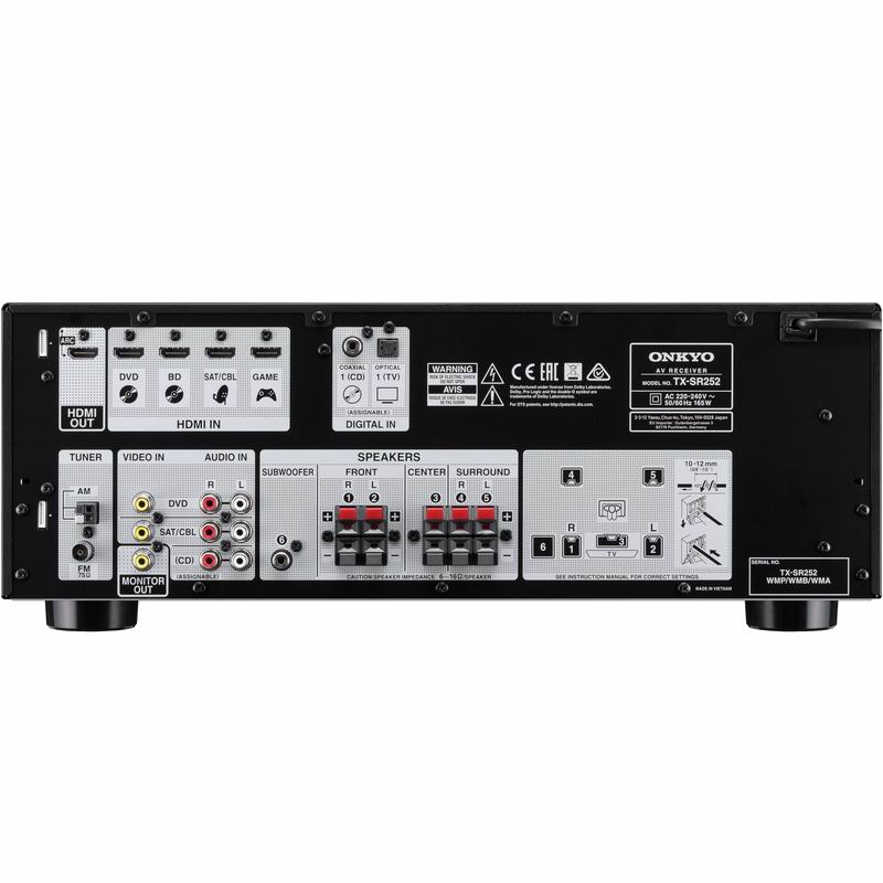 Onkyo TX-SR252 оснащен четырьмя HDMI-входами и одним выходом, с поддержкой передачи 4K/60 Гц видео и возвратного аудиоканала ARC. Также аппарат имеет три линейных аудиовходов (дополненных коаксиальным и одни оптическим входами). Также на задней панели ресивера имеются разъем для подсоединения сабвуфера. Пружинные клеммы для пяти акустических систем снабжены удобной цветовой маркировкой. Onkyo TX-SR252 имеет декодеры окружающего звучания с поддержкой HD-форматов (Dolby TrueHD и DTS-HD MA) на базе 32-битного DSP. Во всех каналах аппарата установлены цифро-аналоговые преобразователи на базе микросхем Burr-Brown с параметрами 24 бит / 192 кГц. Для дополнительной обработки звука предусмотрен 4-режимный DSP, а подать аудиосигнал по максимально короткому пути можно с помощью режимов Pure Audio и Direct Mode.