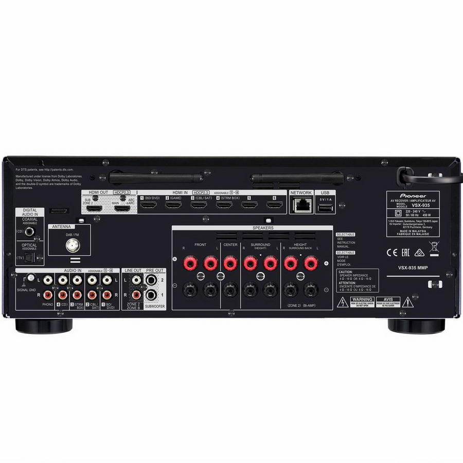 AV-ресивер Pioneer VSX-935 обладает обновленным набором функций и улучшенным звучанием по сравнению с прежней моделью, что, с учетом скромной стоимости, сделало его одной из самых привлекательных моделей в данной ценовой категории. Имеющихся семи усилителей на борту Pioneer VSX-935 достаточно для построения системы окружающего звучания в конфигурации от классической 7.1 с четырьмя тыловыми колонками до 5.2.2 с двумя тылами и парой потолочных АС для работы с новыми форматами саундтреков Dolby Atmos и DTS:X. Кроме количества каналов, основным отличием ресиверов серии VSX от топовой линейки LX компании Pioneer стало использование классического усиления в классе AB, выполненного на дискретных элементах. Аналогичные усилители работают в младших моделях серии LX, а старшие оснащаются фирменными усилительными модулями Direct Energy HD Class D3, работающими в классе D.