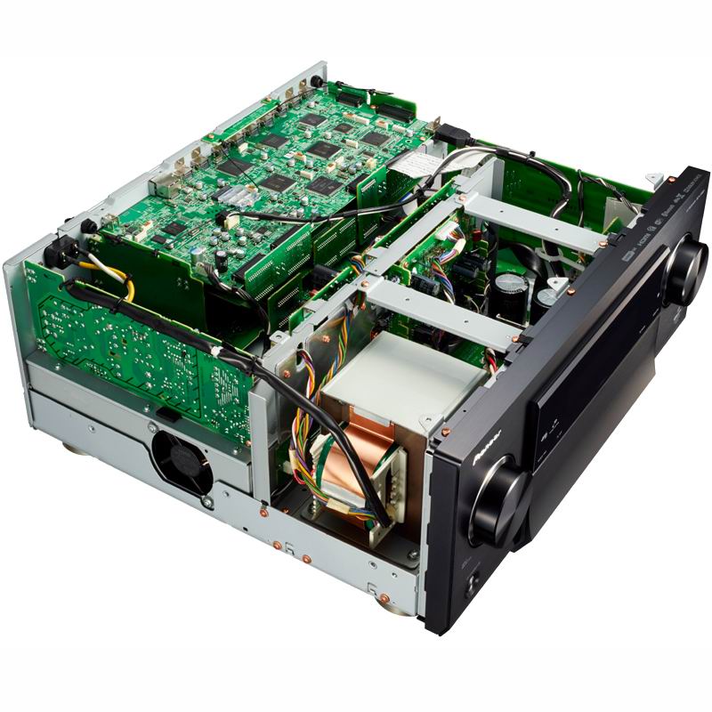 Мы уже рассказывали подробно о новом кинотеатральном формате саундтреков к фильмам Dolby Atmos. Наиболее полно преимущества объектно-ориентированных форматов реализуются в больших коммерческих кинозалах с множеством дискретных каналов. Для домашних кинотеатров была сделана адаптация стандартов. Максимальная конфигурация многоканальной аудиосистемы домашнего кинотеатра Dolby Atmos и DTS:X на сегодня - 7.2.4. То есть, стандартная схема окружающего звучания 7.2 дополнена четырьмя потолочными акустическими системами. Как несложно посчитать, для реализации такой концепции без помощи внешних усилителей мощности AV-ресивер должен быть оснащен 11 каналами усиления. В номенклатуре Pioneer этим требованиям отвечает топовая модель серии LX - Pioneer SC-LX901, о которой мы рассказывали год назад. Сегодня же у нас в лаборатории следующая за флагманом модель Pioneer SC-LX801. От старшего брата ее отличает лишь одно - меньшее количество каналов усиления. Их здесь девять. При этом, сами усилители - фирменные модули Direct Energy HD, здесь такие же, как в топовой модели. Работающие в классе D и отличающиеся высоким КПД, эти усилители позволяют обойтись без тяжелых и габаритных силовых трансформаторов и радиаторов охлаждения выходных каскадов. В результате AV-ресивер с девятью, и даже одиннадцатью каналами усиления получается сравнительно компактным и легким.