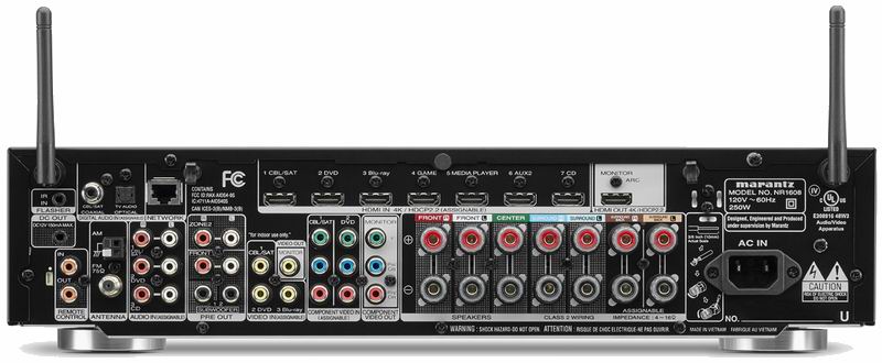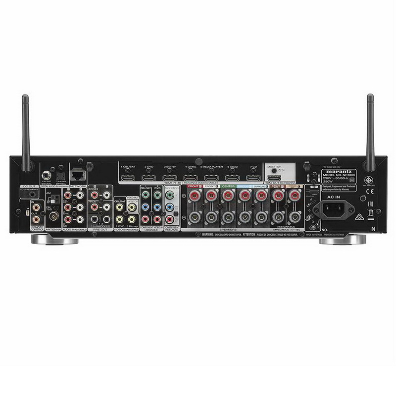 Все восемь HDMI-входов ресивера поддерживают 4K-видео UHD (60 Гц), протокол HDCP 2.2, стандарты Dolby Vision (12-битовая глубина цвета и поддержка динамических метаданных) и HDR10, субдискретизацию 4:4:4 Pure Color и др. С новой прошивкой открывается доступ к использованию формата Hybrid Log-Gamma (HLG, гибридная логарифмическая гамма-функция), разработанного для HDR-телетрансляций. Функция HDMI CEC позволяет управлять ресивером с помощью пульта телевизора с технологией Smart TV. Среди разъемов Marantz NR1608 можно выделить наличие выходов для двух сабвуферов, а также для зоны 2. Имеются оптический и коаксиальный входы, а для подключения АС служат семь пар винтовых клемм с цветовой маркировкой.