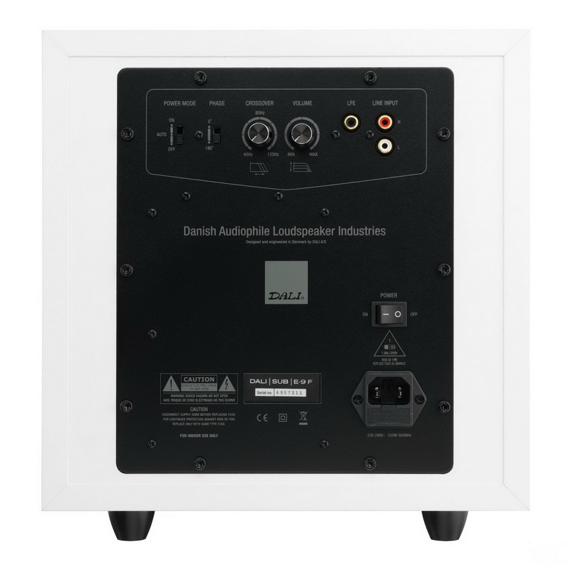 На задней панели SUB E-9 F размещены органы регулировки громкости, фазы и верхней частоты среза, а функция power on/off автоматически включает его при обнаружении сигнала. Имея как LFE, так и LINE входы, сабвуфер легко вписывается в любую AV систему.