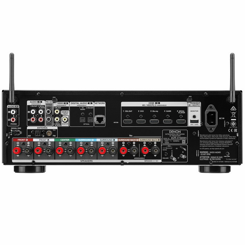 Denon AVR-X1700H оснащен шестью HDMI-входами и выходом с поддержкой новейшего стандарта HDCP2.3. Аппарат не только может осуществлять коммутацию видео с параметрами 8K/60 Гц, Dolby Vision, HDR10 и HGL, но также поддерживает технологию eARC, которая позволяет передавать звук в 3D-форматах. Также благодаря режиму Low Latency AV-ресивер можно использовать совместно с игровыми приставками.
