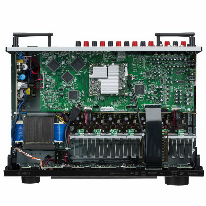 Произведены и другие замены в комплектующих. В частности, в буфере теперь стоят особые электролиты по 10 000 мкФ, а не стандартные на 6800 мкФ. Заодно переработаны схемы стабилизаторов питания ЦАПа, DSP и платы HDMI. Даже такой относительно новый элемент — сетевая плата HEOS — и та здесь внешне другая. Так что количество изменений солидное, даже странно, что Denon не назвала эту модель, например, AVR-X1800H и не отнесла ее к следующему поколению.