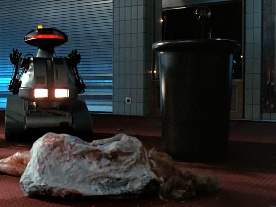 В универмаге новые технологии безопасности. Теперь обычных охранников будут заменять три робота, по одному на этаж. В обязанность роботов входит только поимка воришек, отличить воров от персонала они могут по специальной карточке — удостоверению работника магазина.