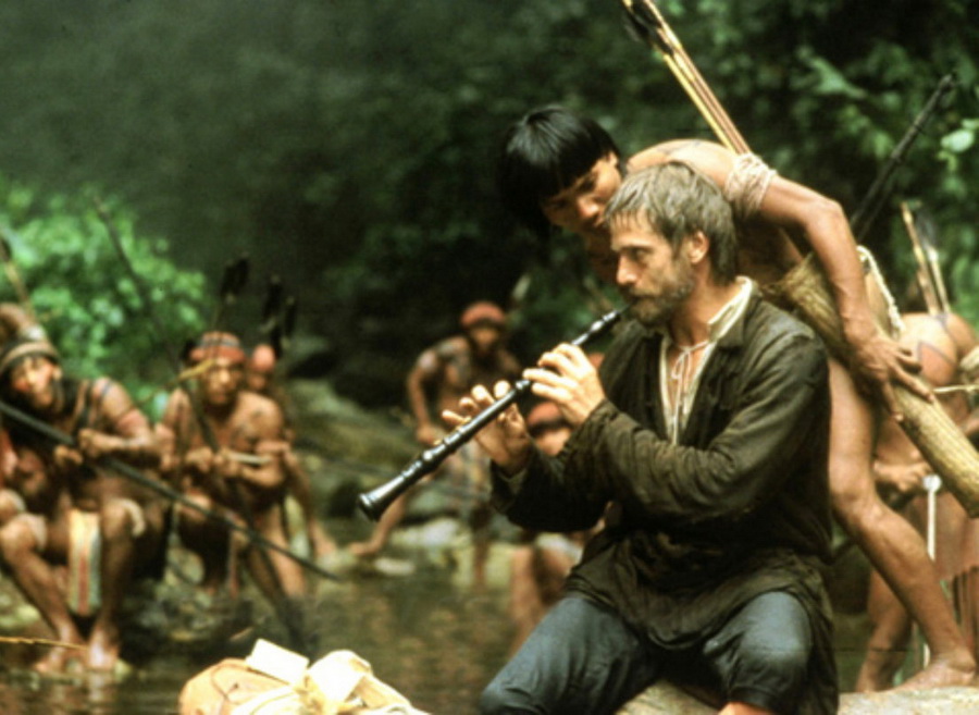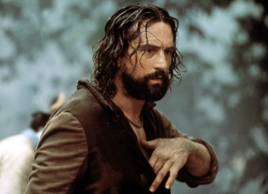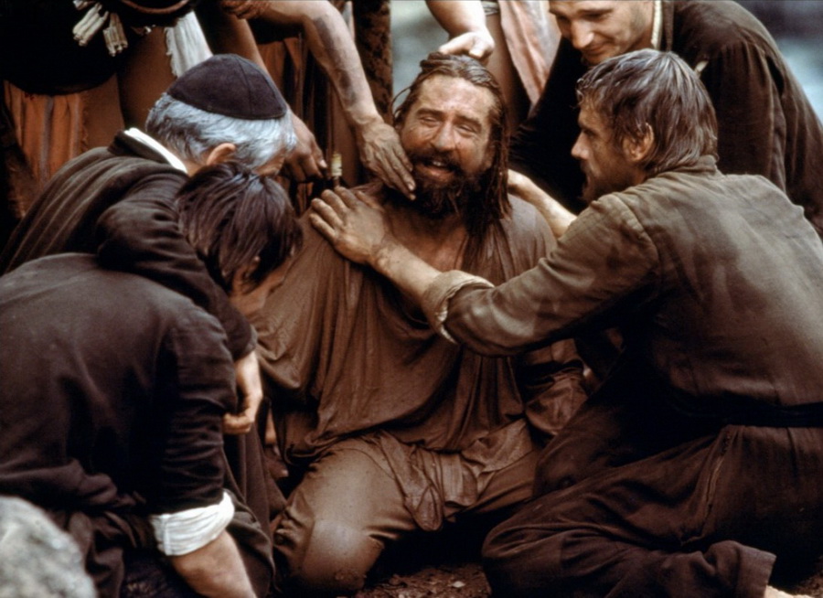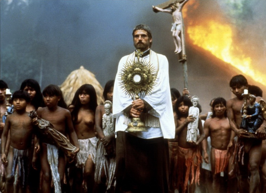 Река, протекающая сквозь густые джунгли, несет замученного иезуитского священника, привязанного к грубо сколоченному кресту. Распятие проносится через скалистые стремнины и в один момент, полный ужаса и завораживающей красоты, обрушивается вниз с 70-метровой высоты и исчезает в рокочущем водопаде.