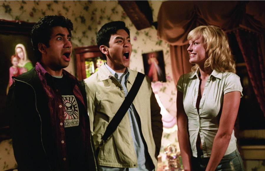 Во время съёмок сцены, где Гарольд и Кумар идут к дому Страшилы, Джон Чо понятия не имел, что там в вольере живёт немецкая овчарка. Его испуганная реакция на лай собаки была совершенно не наигранной.