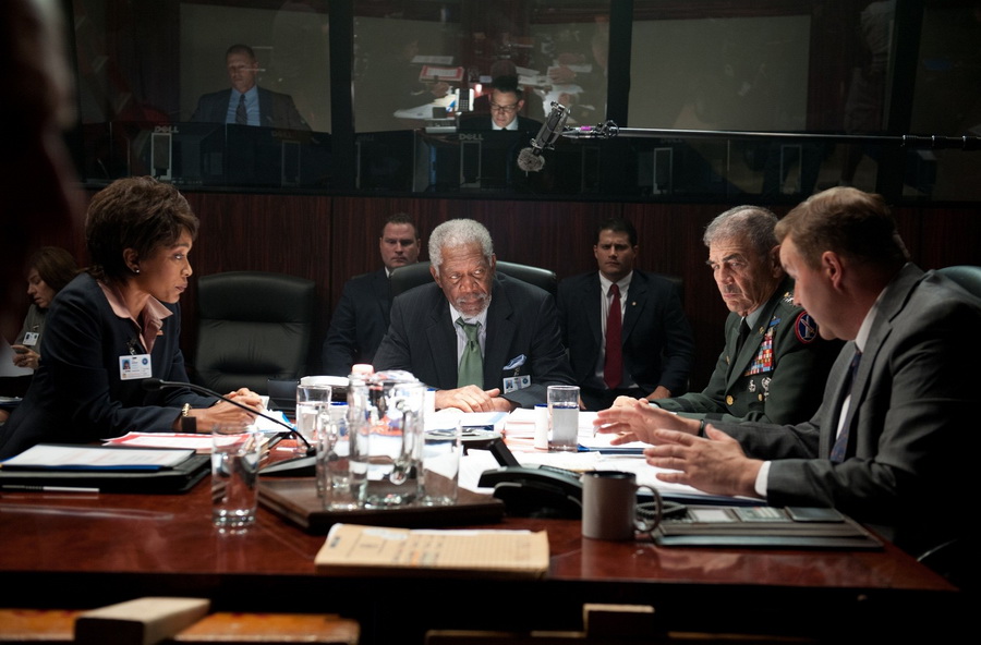 Морган Фриман снимался в сцене в комнате кризисных ситуаций в самый разгар интернет-слуха о его смерти. Он часто начинал съемочный день, напевая остальным актерам старые джаз-песни, и этим умилял ничего не подозревающую съемочную группу.