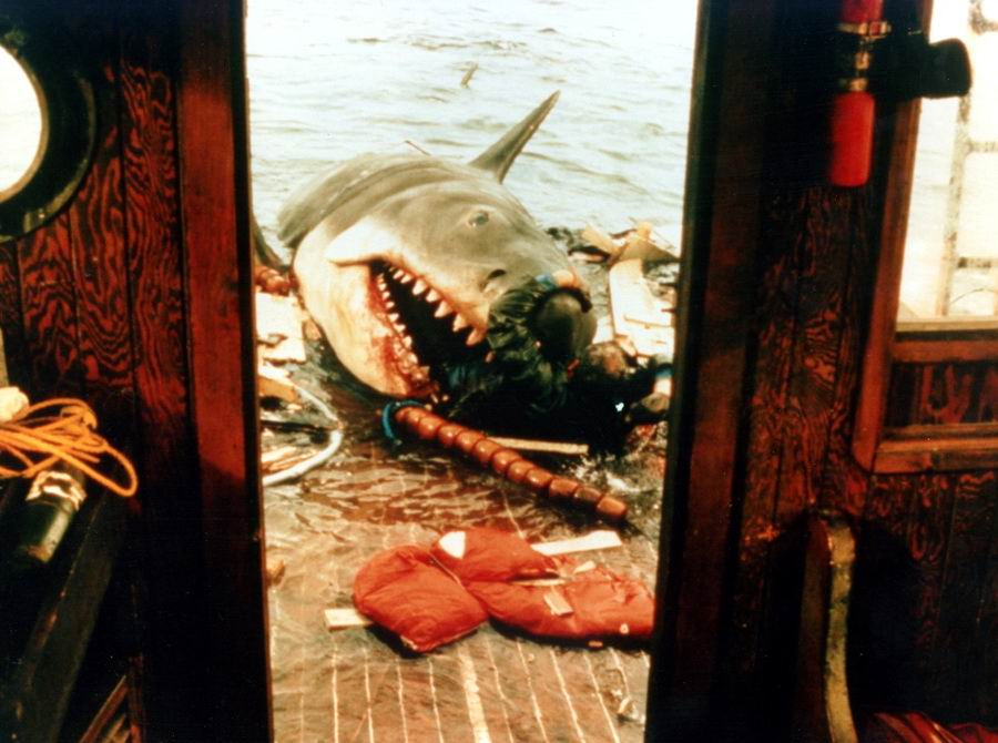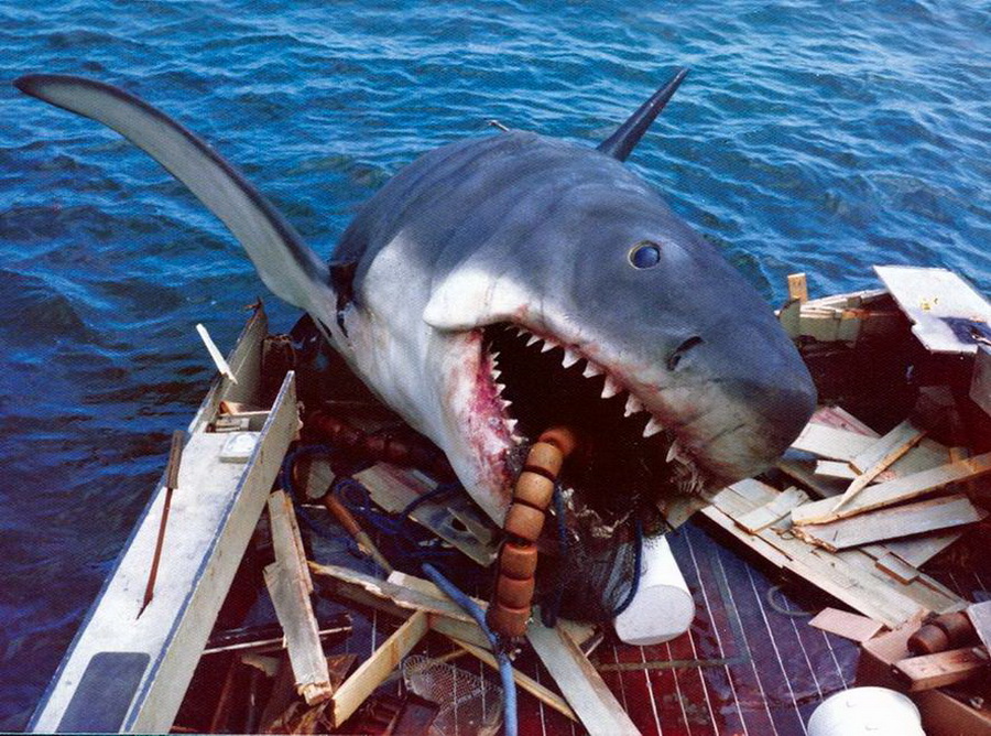 Построенная механическая акула, когда ее привезли на остров Мартас-Винъярд и поместили в первый раз в воду, попросту утонула, так что команде техников пришлось в срочном порядке немного ее переделать.