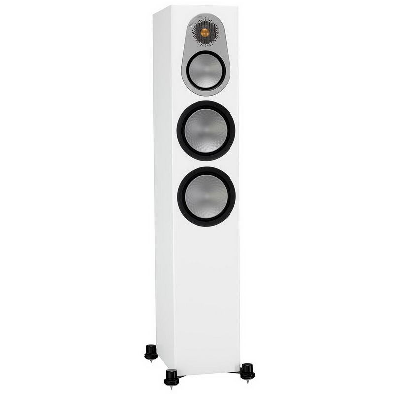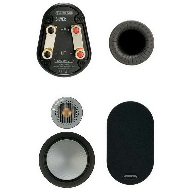 Под металлической сеткой Monitor Audio Silver 300 скрыт дюймовый твитер с купольной мембраной из материала C-CAM, представляющего собой алюминиево-магниевый сплав с покрытием из керамики. На поверхность купола нанесен тонкий слой золота, что способствует увеличению его жесткости и улучшению демпфирующих характеристик. Твитер имеет закрытую тыльную камеру и способен достичь предела АЧХ в 35 кГц. СЧ-диапазоном распоряжается новый 4-дюймовый драйвер, оснащенный специальной катушкой, благодаря которой удается минимизировать искажения. Он также имеет C-CAM-диафрагму, но с нанесенными на ее поверхность округлыми оттисками (технология RST), которые усиливают жесткость и противостоят деформациям, вызванным силами изгиба. Диффузоры двух 6,5" длинноходных вуферов тоже выполнены из материала C-CAM с технологией RST. Их шасси отлито из особого высокопрочного полимера.