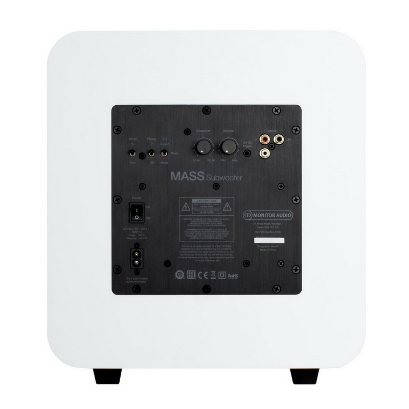 Корпус MASS Subwoofer изготовлен из высокоплотного МДФ, толщиной не менее 15 мм. За воспроизведение баса отвечает драйвер диаметром 203 мм с конусом из Metal Matrix Polymer (MMP II). Управляет динамиком усилитель класса D мощностью 120 Вт. Цифровая обработка звука (DSP) обеспечивает точные характеристики фильтра. Саб выполнен в демпфированном корпусе из MDF и имеет несколько настроек звучания для наилучшего воспроизведения различного контента. : «Музыка», «Кино», «Удар».
