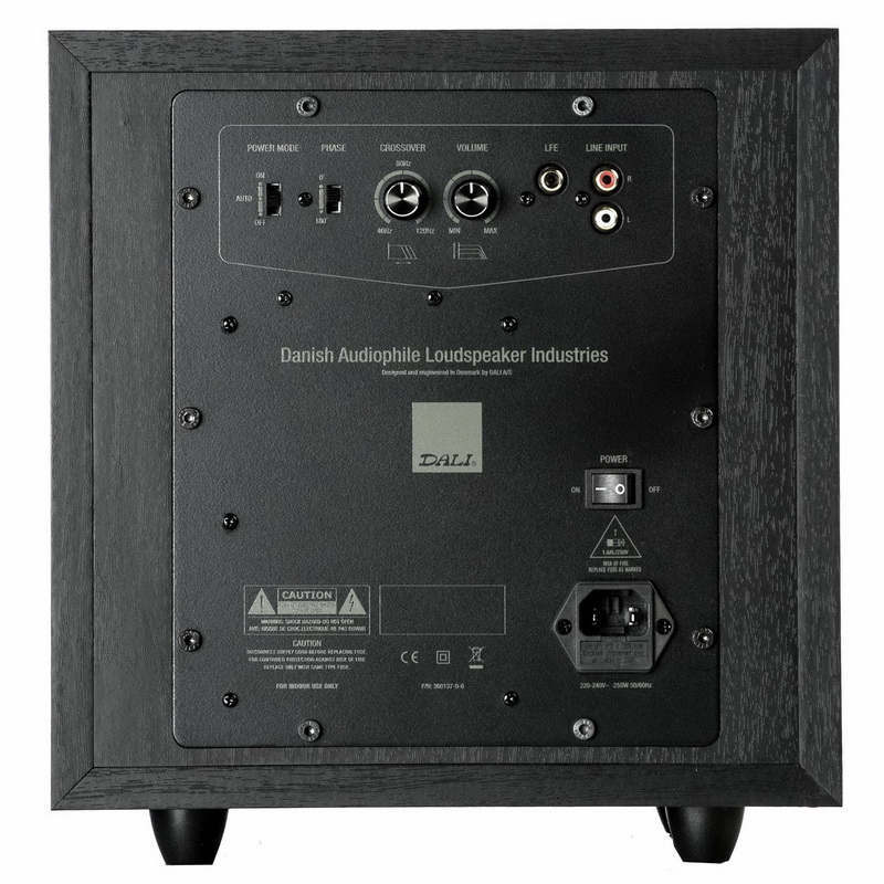 На задней панели DALI SUB E-9F размещены органы регулировки громкости, фазы и верхней частоты среза, а функция power on/off автоматически включает его при обнаружении сигнала. Имея как LFE, так и LINE входы, сабвуфер легко вписывается в любую AV систему.