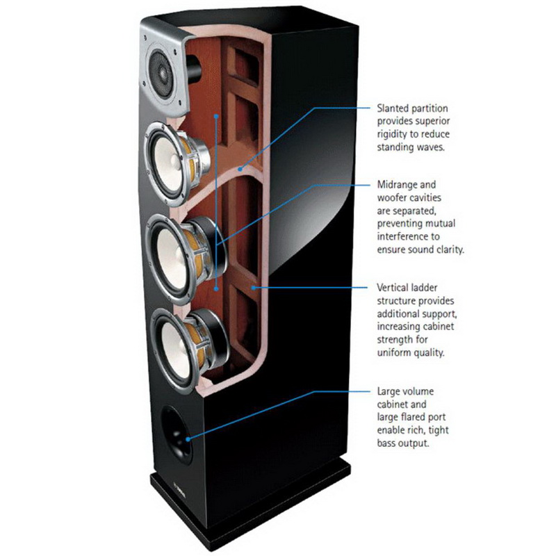 Давняя традиция Yamaha в деле производства высококачественных акустических систем получила наиболее полное отражение в напольной модели NS-F901. Эти акустические системы дают невероятно прозрачный звук при воспроизведении аудиосигнала высокого разрешения. Инновационная конструкция и материалы самого высокого качества делают эту модель поистине безупречной. Модель работает в широком диапазоне частот: от 32 Гц до 50 кГц, однако заявленная номинальная мощность весьма скромна для такой большой АС — всего 50 Вт. Впрочем, запас по максимальной мощности в 200 Вт объясняет, что расчет ведется на исключительно широкий динамический диапазон воспроизведения, а значит на максимально правдоподобную подачу звукового материала высокого разрешения.