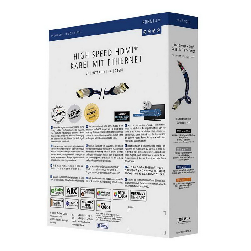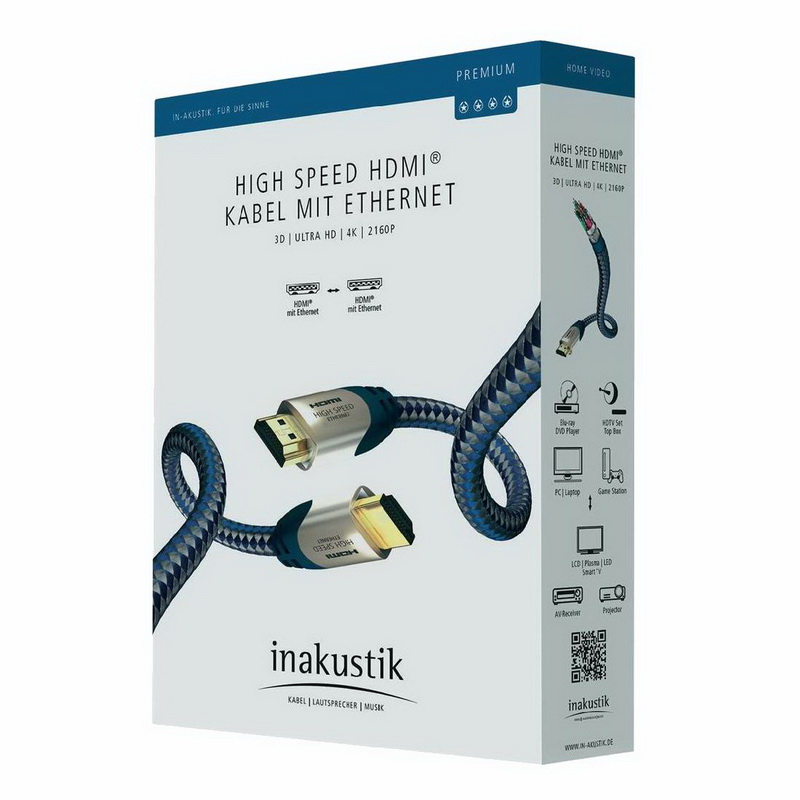 Этот высокоскоростной кабель HDMI с Ethernet из серии In-Akustik Premium поддерживает все аудиоформаты HD и разрешение до 2160p 4k (от 8,0 м 1080p Full HD). Твердые линии данных имеют тройное экранирование. Позолоченные контакты 24 карата обеспечивают оптимальную цифровую передачу. Он подходит для подключения цифровых аудио / видео компонентов, таких как DVD, HD-DVD и Blu-ray плееры или игровые консоли с плазменным, LCD, LED-TV или проектором.