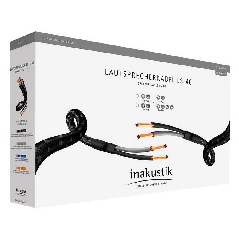Кабель Inakustik Exzellenz LS-40 основана на технических принципах легендарной серии Reference. Он состоит из четырех взаимно скрученных жил. Кожух PE держит провода вместе компактно. Медные провода с PE (полиэтилена) изоляцией. Кабель передаёт динамичный и очень чистый звук.