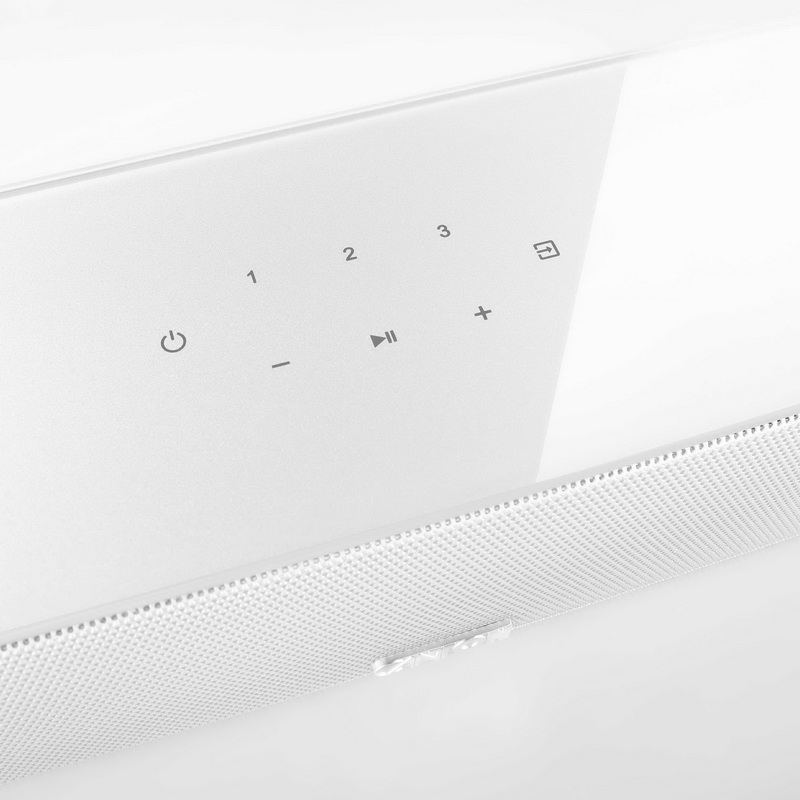 На борту саундбара аж 8 динамиков общей мощностью в 300 Вт: 4 алюминиевых вуфера; 2 алюминиевых СЧ; 2 тканевых твитера. Они закрыты сеткой радиаторы и помещены в качественно собранный корпус из МДФ. На верхней панели устройства располагаются сенсорные органы управления воспроизведением. Также можно управлять аудиопанелью с помощью пульта ДУ или голосом, хоть у самого саундбара нет встроенных микрофонов. Однако достаточно подключить к панели тот же смартфон, чтобы голосовое управление через Siri или Google Assistant стало доступным.