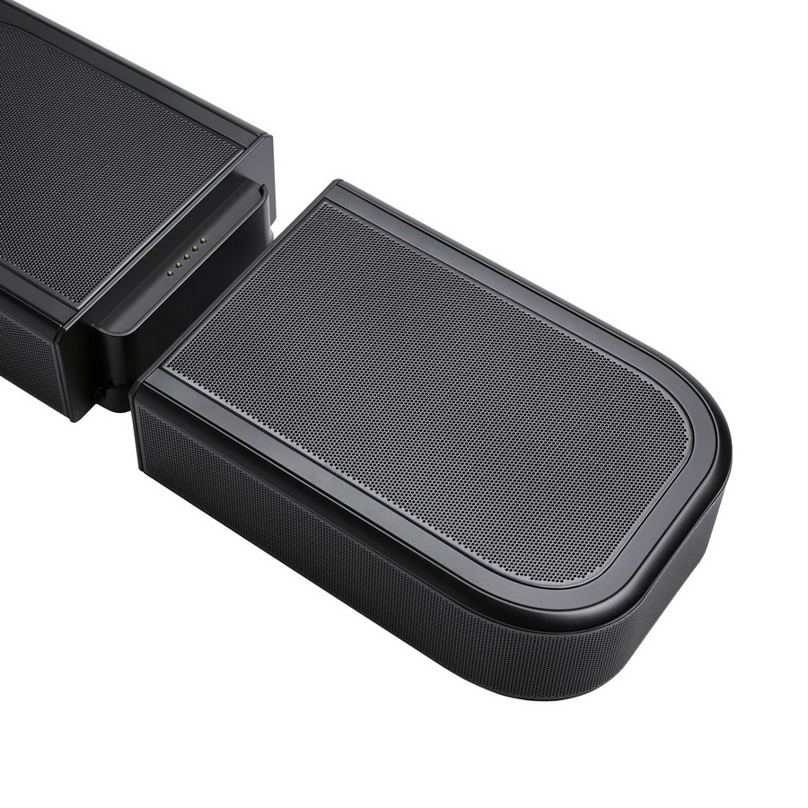 Четыре направленных вверх динамика на звуковой панели и беспроводные задние динамики обеспечивают настоящий звук Dolby Atmos®. Лишние провода не нужны. Без подключения к розетке. Просто снимите съемные динамики объемного звука со звуковой панели — это можно сделать одной рукой — и разместите их там, где вы хотите сесть, и они мгновенно образуют настоящее объемное звучание вокруг. Все очень просто. И во время просмотра нового любимого шоу, и на киновечере заряда перезаряжаемых аккумуляторов динамиков хватит надолго, чтобы вы могли наслаждаться кинематографическим объемным звуком с эффектом присутствия несколько часов подряд. Когда закончите, просто положите их обратно на звуковую панель, чтобы они зарядились за ночь.