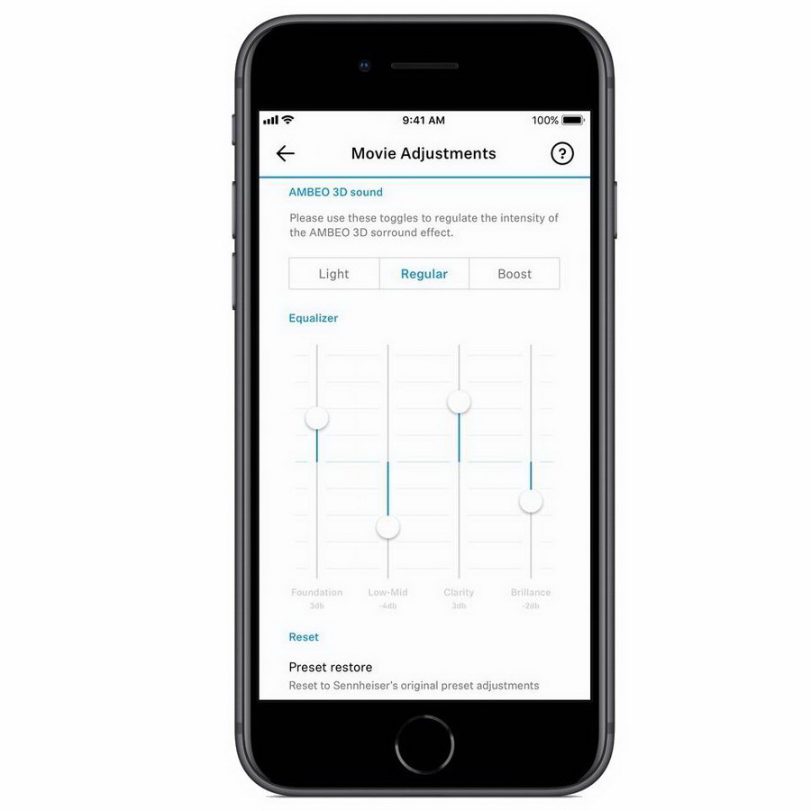 Пресеты кино, музыка, спорт, новости, нейтральный, AMBEO вкл./выкл. (Light, Standard, Boost)
