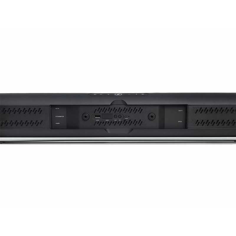 Звуковая панель Harman/Kardon Omni Bar Plus имеет плоскую прямоугольную форму. Устройство очень компактное, поэтому легко размещается под телевизором. Задняя часть панели оснащена кнопкой активации беспроводной связи, разъемами HDMI, цифровым оптическим и аналоговым аудиовходами.
