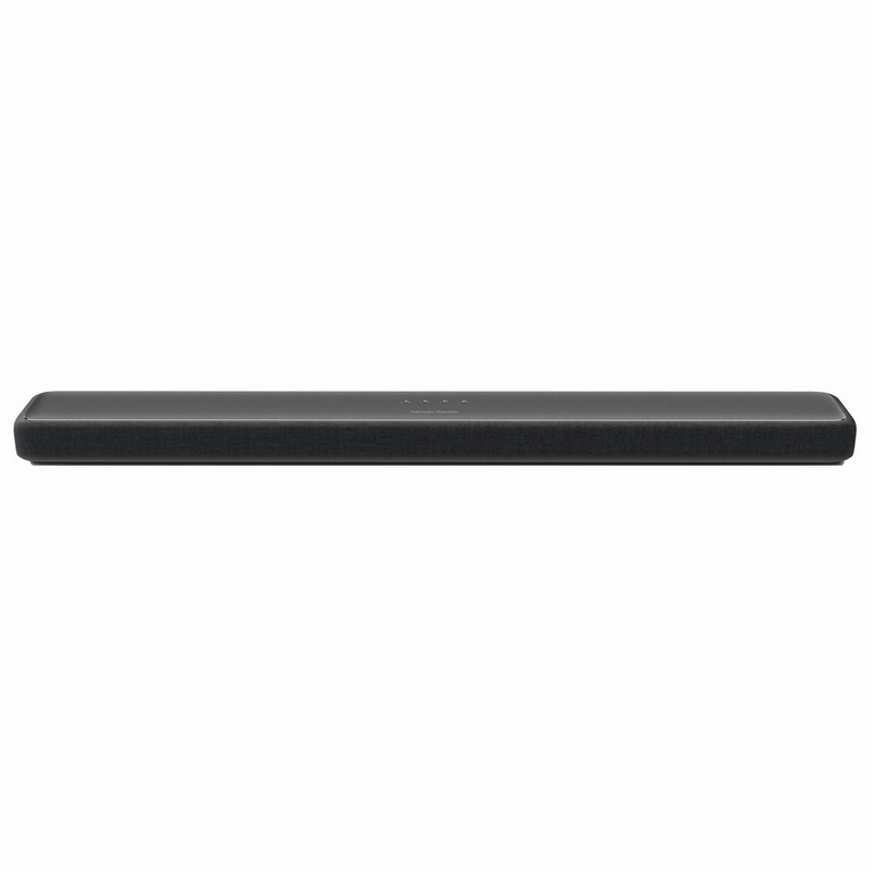 Корпус со скругленными краями оформлен мягким шершавым пластиком и нежной тканью — щупать приятно, хоть в этом и нет необходимости. Цвет у него не совсем черный, скорее темно-серый, графитовый, что позволит подружить его не только с черными телевизорами, но и с серебристыми. Из несимметричных рупоров в торцах приветливо выглядывают чуть сверкающие динамики, добавленные для создания более объемной звуковой картины по технологии MultiBeam. Эта же технология анализирует комнату, в которой расположен саундбар, и оптимизирует отклик под помещение, стремясь «окружить слушателя звуком, а не колонками».