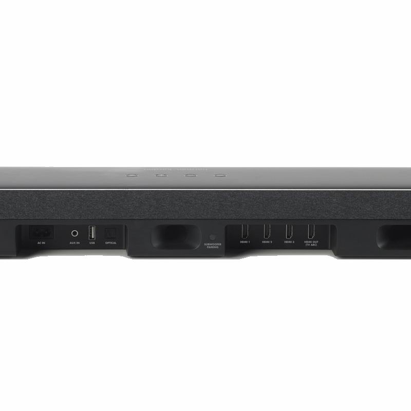 Разъемов у Harman/Kardon Enchant 1300 более чем достаточно. Есть оптика и 3,5-мм аналоговый вход, целых три входа HDMI (все с HDCP 2.2), один выход с поддержкой возвратного канала ARC и USB. Все они расположены в нишах на задней стенке саундбара, туда же выведены широкие порты фазоинверторов, напоминающие выхлопные трубы суперкаров. Из беспроводных подключений доступны Bluetooth 4.2 без поддержки хайрезных кодеков и Wi-Fi с Chromecast.