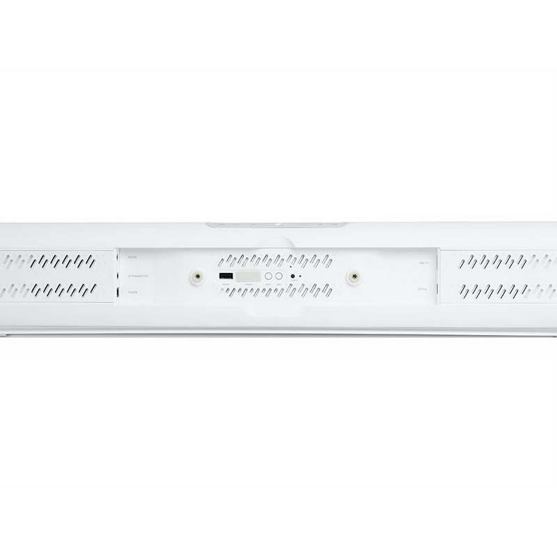Звуковая панель Harman/Kardon Omni Bar Plus имеет плоскую прямоугольную форму. Устройство очень компактное, поэтому легко размещается под телевизором. Задняя часть панели оснащена кнопкой активации беспроводной связи, разъемами HDMI, цифровым оптическим и аналоговым аудиовходами.