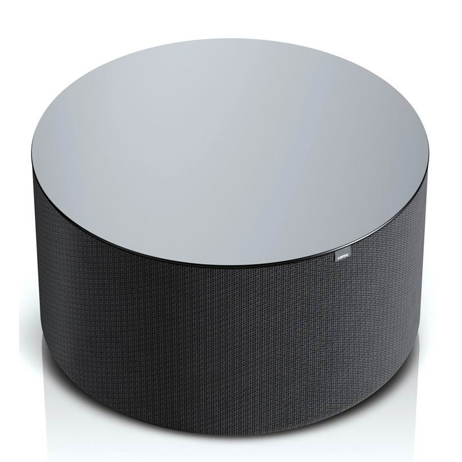 Круглый сабвуфер диаметром чуть менее 40 сантиметров также имеет довольно большие габариты. Однако в нем размещены два активных и четыре пассивных динамика, расположение которых разработано таким образом, чтобы предотвратить раздражающий гул. Поскольку он также беспроводным способом подключается к Klang Bar5 MR, его можно довольно гибко размещать в комнате.