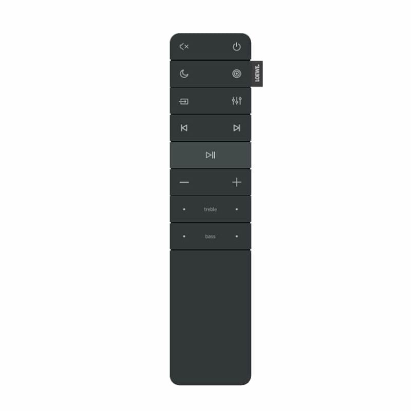 В комплект саундбара Loewe также входит пульт дистанционного управления, позволяющий регулировать основные параметры, такие как громкость, высокие и низкие частоты, а также переключаться между различными предустановленными звуковыми режимами. Loewe удалось добиться здесь элегантного минималистичного дизайна. Конечно, благодаря функции eARC, вы также можете легко регулировать громкость с помощью пульта от телевизора.