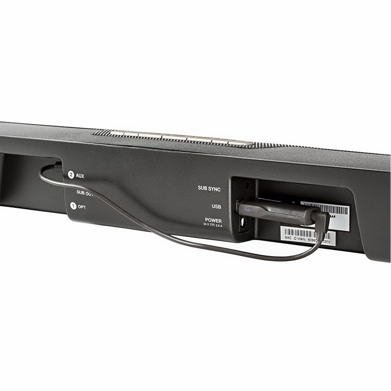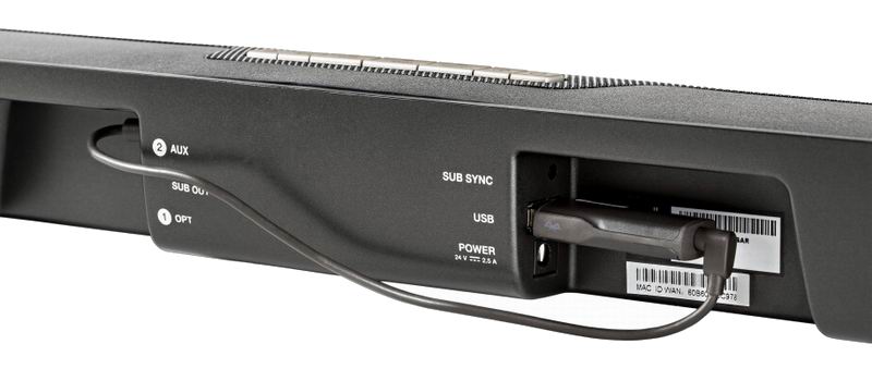 Входы саундбара Aux/Bluetooth (3,5 мм), оптический, USB-порт для питания Bluetooth-адаптера и для подсоединения Ethernet-адаптера с целью подключения к сети Интернет