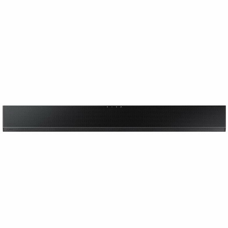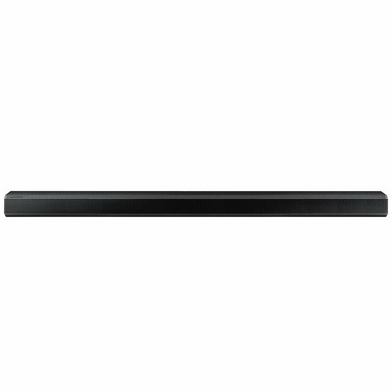 Общий вид саундбара скромный и стильный, он имеет надежную конструкцию и матовую черную отделку. За округлой металлической сеткой находятся три фронтальных канала и отверстия для излучателей Acoustic Beam, которые теперь расположены в угловой секции вдоль верхней передней части. Samsung Q800T имеет удобный буквенно-цифровой дисплей, который предпочтительнее линейки светодиодов, почему-то тоже называемой некоторыми изготовителями «дисплеем». Он расположен спереди справа и отображает основную информацию о включении, уровне громкости, выбранных входах и различных режимах звука.