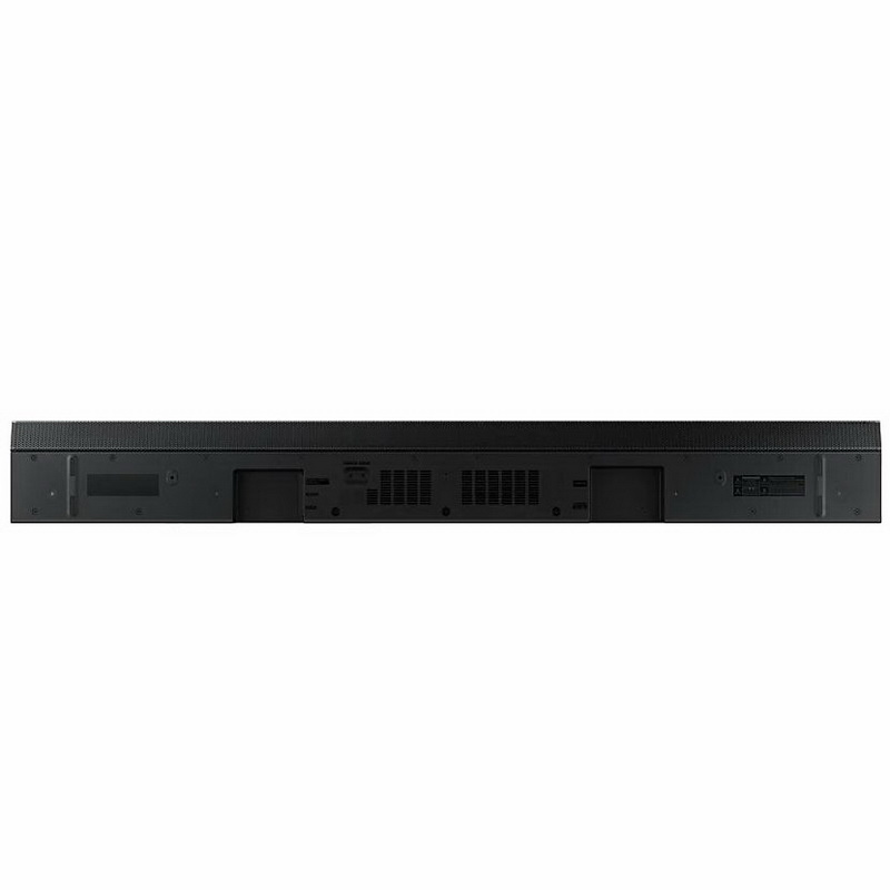 Главной особенностью Samsung HW-Q800T является его способность декодировать Dolby Atmos и DTS: X, создавая захватывающий объемный звук в конфигурации 3.1.2. Эта конфигурация подразумевает наличие трех встроенных фронтальных каналов, беспроводного сабвуфера и фирменной технологии Acoustic Beam. Фронтальные левый и правый каналы состоят из НЧ-динамика и твитера, в центральном канале используется широкополосный динамик, а технология Acoustic Beam основана на использовании 56 отверстий, действующих как отдельные излучатели, которые создают панорамную звуковую картину над головой слушателя.