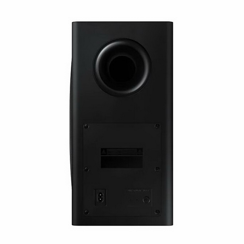 Саундбар HW-Q800T можно разместить на стойке или на стене, и если вы предпочитаете последнее, то в коробке найдутся необходимые кронштейны, винты и шаблон. Звуковая панель имеет размеры 980 x 60 x 115 мм (ШxВxГ) и весит 3,6 кг. Входящий в комплект беспроводной сабвуфер – такая же модель с фазоинвертором на задней панели, что и у саундбара прошлого года. Он оснащен 8-дюймовым басовиком, расположенным на боковой панели, и по утверждению Samsung, может воспроизводить басы с 35 Гц. Корпус сабвуфера выполнен из MDF, и его дизайн и отделка совпадают с саундбаром. Размеры сабвуфера составляют 205 x 403 x 403 мм (ШxВxГ), а его вес 9,8 кг.
