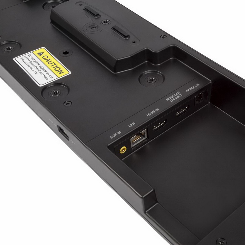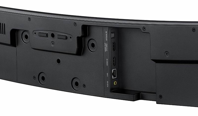 Изогнутая конструкция, шириной около 1,5 метра, чем-то напоминает, то ли летящий аппарат, то ли бумеранг, внешний вид и качество сборки HW-J8500 оставляют очень хорошее впечатление. Девять динамиков в корпусе из матового металла и пластика представляют ощущение единого целого. Зеркальные панели, которые украшали боковые панели прежних саундбаров Samsung уступили место дополнительным динамикам для расширения эффекта объемного звучания. На верхней плоскости размещены кнопки питания, выбора источника и уровня громкости. На задней панели устройства имеется разъем для подключения блока питания, порт USB и кнопка для подключения к сети Wi-Fi. Рядом расположена небольшая ниша с дополнительным набором интерфейсов, в том числе есть аналоговый линейный вход, LAN, вход и выход HDMI и оптический аудио выход. Мы надеялись увидеть дополнительный вход HDMI, но, к сожалению, он оказался только один.