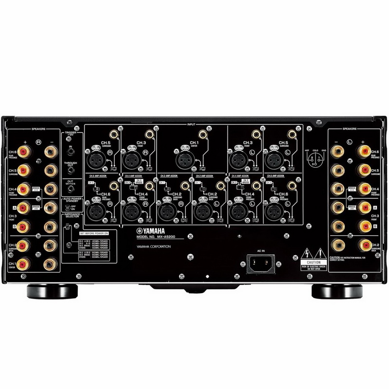 Крупный металлический корпус усилителя мощности Yamaha MX-A5200 украшен монолитной алюминиевой лицевой панелью. Единственным акцентом во внешности усилителя стала большая круглая кнопка включения питания, подсвеченная по окружности мягкой синевой. На этом возможности управления питанием не исчерпываются. На задней стенке корпуса есть вход триггера 12 В для дистанционного включения усилителя (к которому имеет смысл подключить соответствующий выход с процессора Yamaha CX-A5200), а также сквозной выход триггера для организации цепочки управляемых по питанию компонентов и собственный выход триггера, если возникнет необходимость управлять питанием других устройств с усилителя, а также переключатель, активирующий автоматический режим, в котором Yamaha MX-A5200 переходит в режим Standby через 8 часов после включения. При этом, автомату безразлично есть ли на входах усилителя полезный сигнал. Слева от клавиши питания есть две небольшие кнопки коммутации акустических систем на одной паре каналов усиления, но они практически незаметны и не отвлекают внимания. Коммутационная панель на задней стенке корпуса логично разделена на зоны.