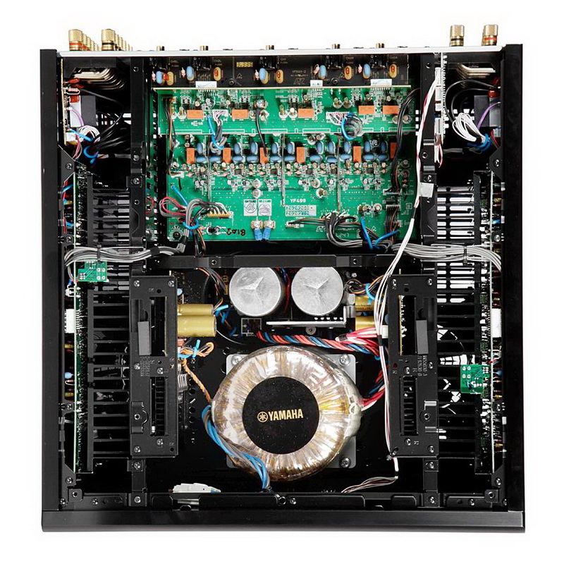 Непосредственно за лицевой панелью смонтирован мощный тороидальный трансформатор, за которым расположилась плата блока питания с внушительными конденсаторами. Вдоль правой и левой стенки корпуса установлены литые ребристые радиаторы охлаждения выходных каскадов, реализованных на дискретных элементах и работающих в классе A/B с трехкаскадной схемой Дарлингтона и обратной связью по току. Охлаждение здесь полностью пассивное – никаких шумящих вентиляторов.